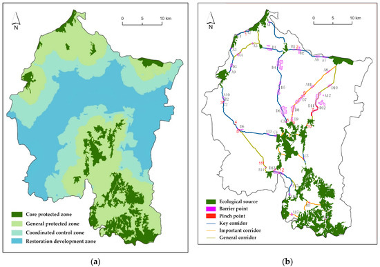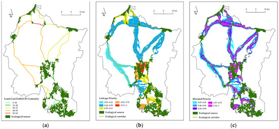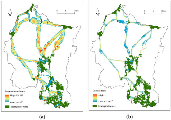 The extraction of ecological corridors was performed with the Build Network and Map Linkages tools in the Linkage Mapper 3.0 toolbox. In circuit theory, ecological sources are equivalent to circuit nodes, and the non-ecological-source areas are equated with the resistors with different resistance values. The random walk of electrons in the circuit was used to simulate the migration process of individual species in the landscape so as to predict the movement law of species and identify multiple paths in the landscape surface—that is, the ecological corridors [30,51]. Ecological nodes include barrier points and pinch points, which could be identified by the Barrier Mapper and Pinchpoint Mapper tools in the Linkage Mapper 3.0 toolbox.