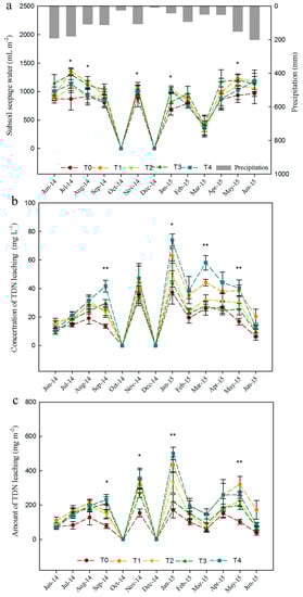 Precipitation and subsoil seepage water (a), concentration (b), and amount (c) of TDN leaching every month. T0, no tillage; T1, semiannual tillage; T2, tillage every four months; T3, bimonthly tillage; T4, monthly tillage. The asterisk (*) and (**) represent significant differences among different tillage treatments at the same time period (one-way ANOVA, p < 0.05 and p < 0.01, respectively). Bars represent mean ± standard error (n = 4). TDN represents total dissolved nitrogen.