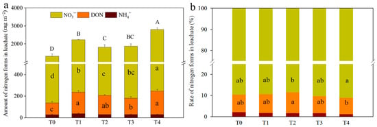 Amount (a) and rate (b) of nitrogen forms (including NO3¯, DON, and NH4+) in leachate under tillage disturbance after 1 year. T0, no tillage; T1, semiannual tillage; T2, tillage every four months; T3, bimonthly tillage; T4, monthly tillage. Different letters indicate significant differences among treatments (one-way ANOVA, p < 0.05). Bars represent mean ± standard error (n = 4).