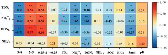 Correlation analysis of N leaching and soil physicochemical properties. The asterisk (*) and (**) represent that the correlation is significant (p < 0.05 and p < 0.01, respectively). TNS, NO3¯S, DONS, and NH4+ represent total nitrogen, nitrate, dissolved organic nitrogen, and ammonium in the soil after one-year simulation experiment. TDNL, NO3¯L, DONL, and NH4+L represent the accumulative amounts of total nitrogen, nitrate, dissolved organic nitrogen, and ammonium in leaching water during the one-year experiment. E-Ca represents exchangeable calcium in soil.