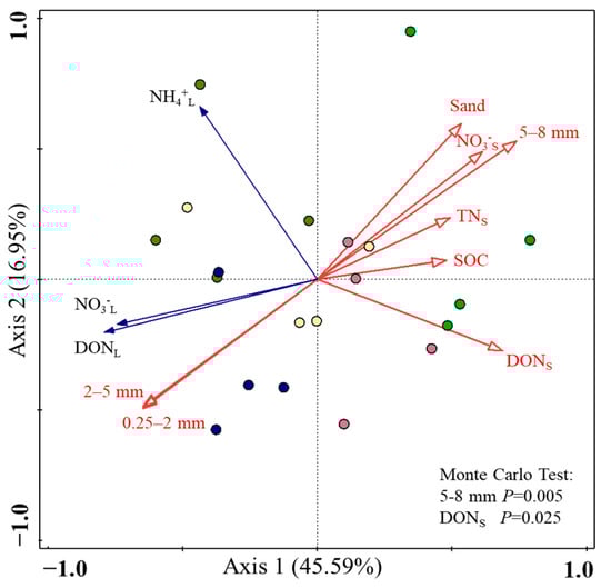 The RDA identified soil 5–8 mm aggregate and DON as the major explanatory variables for the composition of N leaching (p < 0.05). All selected parameters together explained 62.54% of the variance, with axes 1 and 2 explaining 45.59% and 16.95% of the variance, respectively (Figure 5).