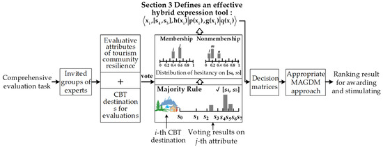 Increasing disturbances and changes in situated internal and external environments, especially the profound detrimental influences brought about by the outbreak of pandemics, have been compelling destination management organizations (DMOs) and local related governments to integrate destination management and disaster management (DM2) [20]. The proposal of integrative action framework of destination management and disaster management has expanded to include a portfolio of unprecedented tasks [20], among which building tourism community resilience emerges as an urgent one. As elaborated above, building resilience cannot be treated as a diachronic process when contextualized with detrimental eventualities of high frequency [17]. As a result, DMOs and local governments all over the globe have to take pertinent strategies to prompt tourism community resilience building. In alignment with various countries’ institutional experiences [42], the strategy of promoting development through evaluation provides an appropriate and efficient governance strategy. The fundamental logic underlying the strategy is that, based on the ranking results derived from comprehensive evaluation, awarding and stimulation can be then applied and function as motivational mechanisms in which resilience-building performances of tourism communities would be efficiently improved through iterative knowledge sharing and purposeful learning. Therefore, comprehensive evaluation of tourism community resilience has become an inextricable task in the integrative practices of destination management and disaster management (DM2). Furthermore, complexity in attributes of tourism community resilience as introduced in Section 2.1 leads to decision-making processes in which assessments on those attributes inevitably will be determined qualitatively by elected decision makers (or decision units) according to their trusted expertise. Subsequently, in this paper, we conceptualize the problem of comprehensive evaluation of tourism community resilience with holding the multiple attributes decision making process as shown in Figure 2.