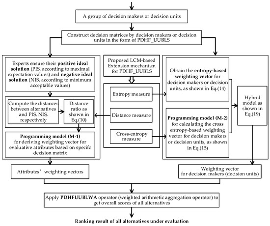 Taking a step further, when confronted with the same obstacles as in conventional hesitant MADM that two hesitant fuzzy elements for comparison usually do not hold the same length, the fundamental modules (such as distance measures [70], entropy measures [71], similarity measures [70], and correlation measures [72]) required in modelling of group MADM approaches under PDHF_UUBLS environments also demand a certain mechanism that is capable of rationally extending any unmatched set, i.e., membership set or nonmembership set, of hesitant fuzzy elements for comparison to have equal length so as to be ready for further computational operations [73]. Currently, in the settings of probabilistic hesitant information, subjective extension mechanisms (i.e., through filling in a set with enough pairs of corresponding maximum, minimum or average values and zero probability to let the set have the same matched length) are still generally adopted [63,74]. Not only that they can hardly keep the original statistical feature value unchanged after extension, the above traditional subjective mechanisms also will result in zero-value phenomena due to setting of zero probability for all added data of derived utility sets which then are fed into information measures used by decision making processes [75,76,77], thereby causing more obvious information distortion with increment in the total amount of values added by subjective extension mechanisms. Interestingly, differing from the subjective extension mechanisms, the special extension solution based on least common multiple (LCM), which was originally put forward for neutrosophic hesitant fuzzy decision-making environments [78,79], provides another effective rationale that utilizes LCM to determine the common length of unmatched hesitant fuzzy elements rather than supposedly referring to the subjective choices. Inspired by the LCM extension mechanism, in this paper, we generalize it to our PDHF_UUBLS environments by adopting LCM as the common length for any unmatched membership set or nonmembership set and then uniformly allocating original probabilistic values to the multiplied membership or nonmembership degrees, so as to avoid subjective data interpolation and the potential information distortion caused by zero-value phenomena mentioned above. Furthermore, on the ground of LCM-based extension mechanism, information measures for IVDHF_UUBLS will be developed, by which an effective MAGDM approach under IVDHF_UUBLS environment will also be constructed and verified.
