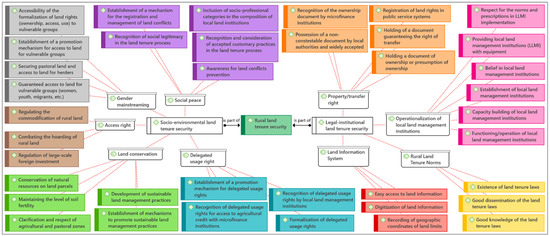 A total of nine dimensions emerge as main elements of rural land tenure security (Figure 2). These are the existence of land tenure norms/laws, functioning of local land management institutions, ownership rights, access rights, use rights, the existence of land information system (LIS), social peace, gender mainstreaming, and land conservation. Figure 2 shows the descriptors used by actors to characterize land tenure dimensions. Two groups of rural land tenure security emerge based on their theoretical orientations: legal-institutional security and socioenvironmental security.