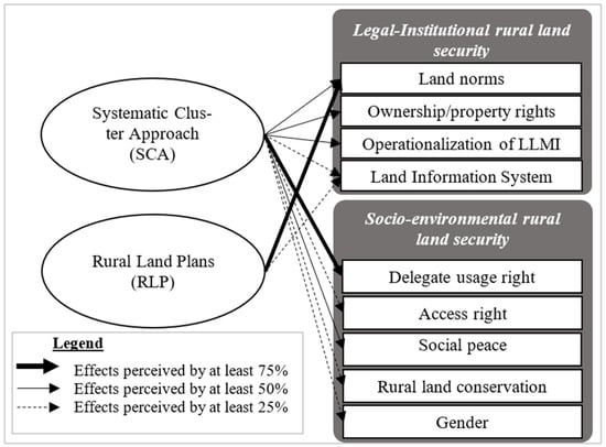 It appears that the implementation of SCA contributes to the achievement of the two categories of land tenure security: the legal-institutional rural land security and the socioenvironmental land security (Figure 3). The legal-institutional rural land security is achieved through three dimensions of land tenure norms, ownership/property rights, and the operationalization of LLMI. The socioenvironmental rural land security is achieved through the promotion of “social peace” and “delegate usage right” dimensions.