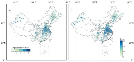 3.2. Spatial Pattern Comparison among the Rebuilt Dataset with Other Existing Datasets