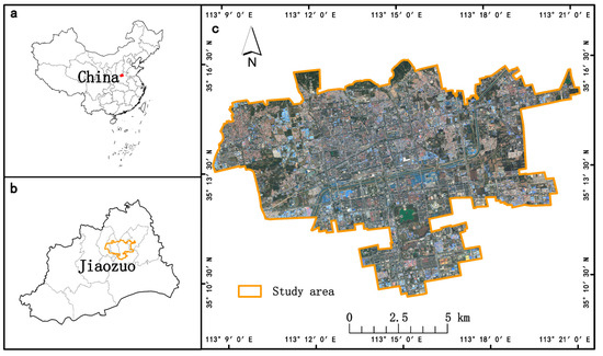 Spatial location of study area. (a) location of Jiaozuo in China. (b) location of the built-up area in Jiaozuo. (c) built-up area in Jiaozuo.