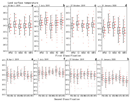 LST in different land use types: (a–d) statistics of LST for the first category of land use classification; (e–h) statistics of LST for the second category of land use classification.