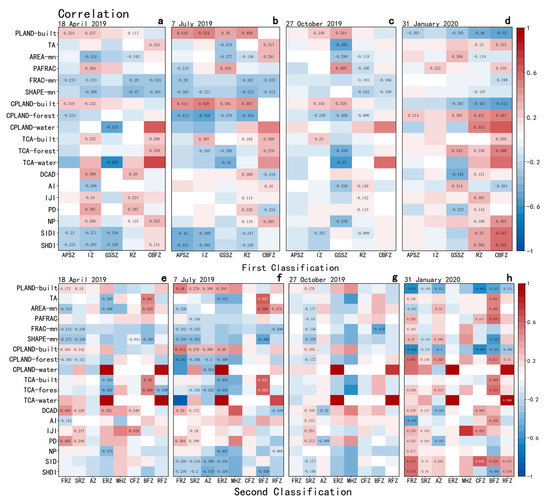 Pearson correlation. Pearson correlation coefficients shown in blank are statistically insignificant; others are significant. (a–d) Correlation analysis and statistics for the first category of land use classification and LST; (e–h) correlation analysis and statistics for the second category of land use classification and LST.