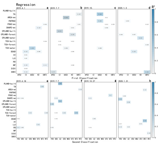 Stepwise multiple linear regression: (a–d) statistics for the first category of land use classification and LST; (e–h) statistics for the second category of land use classification and LST.