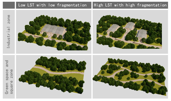 In previous urban planning practices, urban planners often attempted to create a comfortable and cool environment by expanding the number of green spaces. With the rapid expansion of cities, land resources available for green space compete against other socio-economic benefits, making it difficult to carve out any other green space in urban areas. Many scholars suggest that the perspective should be changed and efforts of optimal spatial allocation should be made within the limited space. For example, changing the spatial connectivity and complexity of the city can significantly reduce the LST with no change in green space coverage [40]. In addition, the LSTs of different types of urban land use show significant differences. Therefore, urban planners should adapt different spatial allocation optimization methods for different types of urban land use. For example, increasing the proportion of water bodies in the green space and square zone can significantly reduce LST. Increasing the fragmentation of water bodies or green spaces and reducing the fragmentation of impervious surfaces in the industrial zone can reduce LST (Figure 9). In contrast to the industrial zone, the increase in the fragmentation of impervious surfaces and the decrease in fragmentation of green surface patches are conducive to reducing the LST of the second-class residential zone. The LST of second-class residential zone use is lower than that of first-class residential zone use, so we can also consider vertical urban development to avoid damage to urban green spaces as much as possible [60,67].