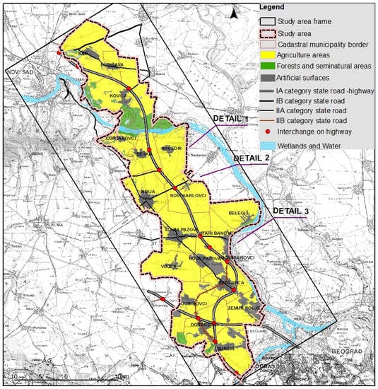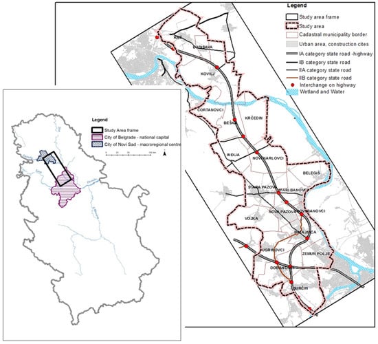 Belgrade is the capital, administrative center and largest city in Serbia, while Novi Sad is the second largest city and an important macroregional urban center. Currently, the Belgrade–Novi Sad metropolitan area is undergoing fast urbanization in relation to the rest of the country. It contains quality agricultural land and spatially attractive zones between the two cities, encompassing a strong infrastructure network with international importance. In this research, the study area comprises 19 settlements within municipalities affiliated to the metropolitan area and the highway impact area, covering around 910 km2 (Figure 1). It should be noted that the Belgrade–Novi Sad metropolitan area in total covers a much wider area than the study area. Along the study area pass two branches of pan-European transport corridor X, with the branch linking Belgrade and Novi Sad with Budapest (national A1 highway) and branch Belgrade–Zagreb–Ljubljana (national A3 highway), as well as corridor VII (Danube River), international railway with an important railway node. Spreading over around 70 km within the study area is State Road IB category No.100, a road with two tracks that represented a main connection between the two cities since 1950s. It remained an important transport communication with Belgrade for numerous settlements along the route. Part of A1 between Belgrade and Novi Sad is in use since 1975.