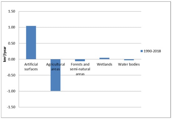From 1990 to 2018, land take consumed 3.1% of agricultural lands that was converted to industrial and commercial land use and further changed due to the expansion of residential housing areas. Observing all Corine Land Cover in study period, areas containing agricultural land have reduced by 100 ha per year. “Artificial surfaces” have increased at the same pace (Figure 3).