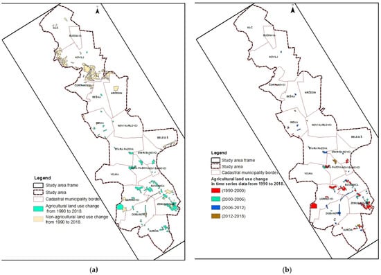 A more detailed insight into the land-use change through the Land Cover Changes (LCC) database suggests that in the observed period of ca. 30 years, out of the total number of all recorded cases (polygons) recoding land-use change, around 45% of polygons show the change from the category of agricultural land use to the category of artificial land use (Figure 4a). The results point out the parts of the study area in which these changes were more distinct, as well as the dynamic of land-use change in the time series from 1990 to 2018 (Figure 4b).