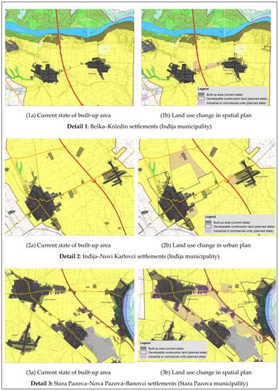Further research of the current planning documents indicated future tendencies in agricultural land take within the study area. Figure 5 shows planned land-use change within the observed locations on the basis of formal spatial and urban plans (Detail 1b, Detail 2b, Detail 3b, respectively). In some of the designated planning documents within the study area, the reduction of agricultural land occurs mainly for the purpose of developing industrial and commercial units outside the construction area of the settlements. According to the planning documentation for Inđija and Stara Pazova municipalities, there is a clear tendency for encouraging greenfield investments and new housing in peripheral urban and suburban areas, especially in the settlements along the main highway corridors. Taking into account the high quality of land in these areas, the planned construction may even cover about 70% of meadow–black soil and about 30% of chernozem [43].