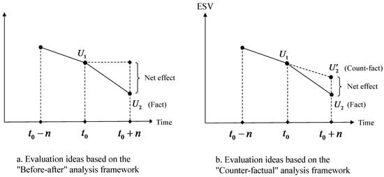 To assess the spatio-temporal impact of the ITIS on the ESV of Hainan Island, the traditional method of assessing the change differential is based on a before–after analysis framework by comparing the differences in the spatio-temporal distribution states of ESV before and after the implementation of the strategy (Figure 1a). However, this assessment idea ignores the role of confounders in the policy, making the obtained conclusions inaccurate. In other words, it ignores the fact that land use and the ecosystem of Hainan Island will not stop evolving even if the strategy is not implemented. Therefore, the assessment results are likely to be overestimated (i.e., they do not exclude the changes in ESV brought about by Hainan’s own socio-economic development).