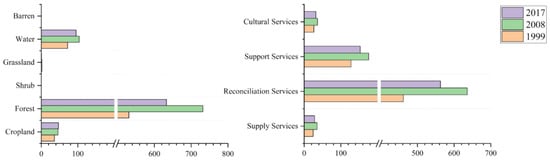 The structure of ESV land-use types in Hainan Island was relatively stable during 1999–2017; from largest to smallest, the land-use types were ordered as follows: forest land, water, farmland, grassland, shrubland, and wasteland. Forest land accounted for 80% of the ESV. The proportion of water in the land-use types of Hainan Island is small—only about 2%—but it provides the second highest ESV value share, which is mainly related to the water having a large ESV coefficient; therefore, its ecosystem service capacity is very strong. The ESV of forest land increased the most between 1999 and 2008, followed by water and farmland. During 2008–2017, the ESV of forest land decreased the most, followed by watershed and grassland, and the ESV of farmland increased during this period.