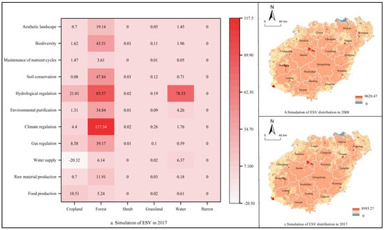 The simulation accuracy verification results show that the Kappa coefficient between the simulated and actual 2008 land-use cover data in the study area is 0.88, indicating that the results of the simulated data in 2008 are in high agreement with the true situation. Therefore, the 2017 land-use cover data obtained from further simulations based on this are highly credible and can be used for comparative analysis under counterfactual scenarios. The simulation results show that the total simulated ESV in 2017 is 54.19 billion yuan under the counterfactual scenario, assuming that the ITIS is not implemented (Figure 5).