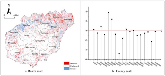 Comparing the spatial situation of ESV with and without the implementation of the international tourism island policy, it is clear that the degree of spatial impact of the ITIS on the ESV of Hainan Island shows a higher degree of coastal change than inland. Except for the unchanged raster, the implementation of the ITIS significantly reduced the ESV in the northeast and southwest areas of Hainan Island, while the increased ESV is mainly distributed in the northwest and north of the forest and farmland junction zone.