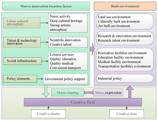 The cultural and creative industries and the creative class mostly rely on the physical space carrier to gather together. The built urban environment is the space that supports the creative industries, and it is also the physical expression of the macro-abstract location factor. The urban built environment mainly refers to the various buildings and places produced by man-made construction and renovation within city limits [38]. Relevant studies have shown that the urban built environment can affect the daily activities of actors, and the social interaction activities of people in the city and the process of interweaving with the built environment will shape regional vitality and innovation [39,40,41]. As a dominant space carrier, the urban built environment includes not only the materiality and spatiality emphasized by the built environment but also social and cultural dimensions [42,43,44]. It is very suitable for the common identification of “hard factor” and “soft factor” of creative industry location. Therefore, micro-observation of the built environment of cultural and creative industries is a favorable perspective to realize the evaluation of creative fields. The built environment of cultural and creative industries is the location that carries creative industry activities, which can meet the needs of knowledge exchange, spillover and acquisition among creative industries [45,46]. At the same time, it provides a space for creative work, living and social activities for the creative class [47]. According to the creative industry theory and “locality” theory [29], and combined with the actual situation of the case, this paper holds that the macro-location factors that are conducive to the formation and development of the cultural and creative industry are mainly urban cultural atmosphere, talent and technological innovation resources, social infrastructure, policy elements, etc. [23]. Through the interaction of macro-location factors, urban space forms creative field, creative class and creative clusters gather in this space under the effect of the creative field and also respond to the creative field. The abstract creative field is expressed at the micro level by the urban environment; that is, it is assigned to the corresponding elements of the urban environment, such as the land use environment, the cultural environment, the arts environment, the scientific research and innovation environment, etc. [48] (Figure 1).