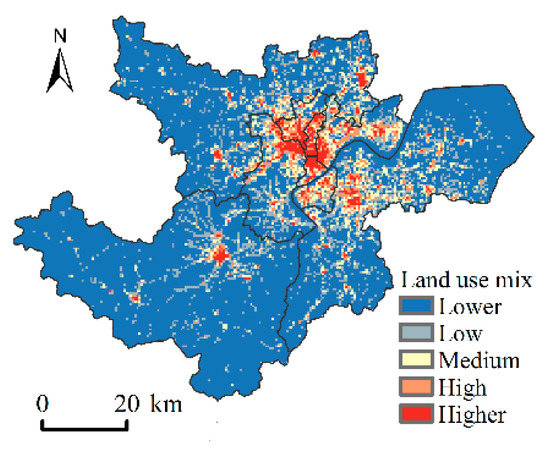 The point data of POI are imported into ArcGIS 10.2 software and vectorized according to the classification, and the degree of land use mixing is calculated by calculating in a 500 m × 500 m grid; that is, the value of POI richness ranges from 0 to 13, and, the higher the value, the more land is used. The higher the degree of mixing, the better the economic power, which is then classified into five categories using a natural breakpoint method (see Table 2). The five categories of Lower, Low, Medium, High and Higher are assigned scores of 1, 3, 5, 7 and 9 from low to high, respectively. In general, the degree of land use mixing in Hangzhou has clear spatial differentiation characteristics (Figure 4): The areas with a high degree of land use mixture are mainly located in the core area of Hangzhou, and the seats of district governments have the highest degree of land use mixture, showing a gradual decrease from the center to the periphery.