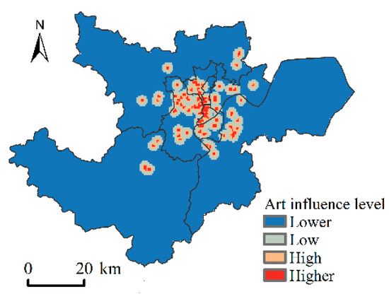 (2) The built environment of art. The built environment of art refers to the places that allow people to appreciate and exchange art. The most representative ones are art galleries, art halls and theaters. The 148 art galleries and theaters with a certain influence in Hangzhou were vectorized in ArcGIS 10.2 software, and their influence area was assigned according to the law of decreasing distance. The farther the value is from the target of art completion, the lower the value is. The areas with relatively strong artistic atmosphere in Hangzhou are mainly located in the core area of Hangzhou (Figure 5).