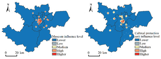 (3) Cultural built environment. The measurement indicators are old cultural relics and old buildings with historical, artistic and scientific value in various museums and cultural protection institutions in Hangzhou. There are 54 museums in Hangzhou, including 38 state museums and 16 non-state museums. Cultural relic protection institutions are divided into three categories: national level, provincial level and municipal level. The extent and intensity of the influence of the various museums and relic protection institutions vary. Accordingly, weights are established to divide the affected areas. The results show that the area with strong cultural atmosphere in Hangzhou is concentrated in the Provincial Cultural Relics Bureau and gradually spreads to Wulin Square, Nanshan Road and Fengqi Road (Figure 6).