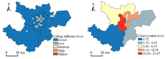 - Innovative talent environment. The education level data of Hangzhou population comes from the actual population survey data of Hangzhou Public Security Bureau in December 2016. According to the actual needs of the development of the cultural and creative industries, combined with the reliability and availability of statistical data, the “innovative talents” refer to the urban resident population with a bachelor’s degree or above and under the age of 60. According to calculations, at the end of 2016, the number of innovative talents in Hangzhou was 813,500, accounting for 12.72% of the total population. The scale of innovative talents in Xihu is the largest, with 210,700 people; the scale of innovative talents in Binjiang is 125,500, accounting for 38.12% of the population of Binjiang, ranking first in the nine districts. In general, the talent scale in the outer areas of the city is relatively small, mainly involving Xiaoshan and Fuyang (Figure 7).