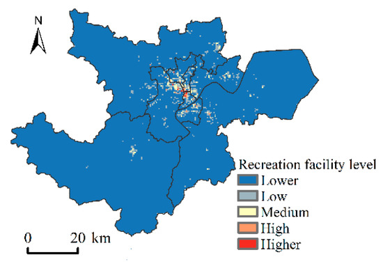 - Recreational facility environment. Creative people have high demands on their working, living and entertainment facilities. A comfortable and pleasant environment is conducive for creative people to relax and find creative inspiration. Cafes, bars, leisure clubs, gyms and restaurants provide creative people with a good space for leisure and communication. Such POI data are processed and statistically analyzed in a 500 m × 500 m vector grid and evaluated and assigned according to the number of POIs included in the grid. The results show that recreational facilities are concentrated in the core area, with Wulin Square, Fengqi Street and Ding’an Street having the highest concentration of recreational facilities along the subway lines and decreasing outward in a circular structure. The peripheral districts and urban recreation facilities are located in the areas where their government agencies are located (Figure 11).