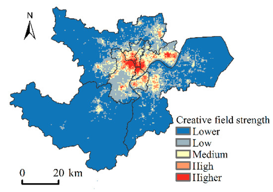 Field strength is one of the concepts of physics. In this paper, the creative field strength is used to describe the strength of the ability to generate and promote cultural and creative industrial clusters in different urban locations; that is, the greater the creative field strength, the more suitable for the layout of cultural and creative industries. According to the corresponding measurement method, the individual indicators produce a 500 m × 500 m grid layer with calculation results. After standardizing the data and using the entropy weighting method to determine the weights, the raster calculator of ArcGIS 10.2 software was used to overlay the indicators and calculate creative field strength of the city based on the raster scale. The comprehensive calculation formula for the creative field strength is as follows: