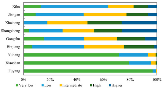 Figure 14. The area occupied by different levels of creative field strength in each district of Hangzhou.