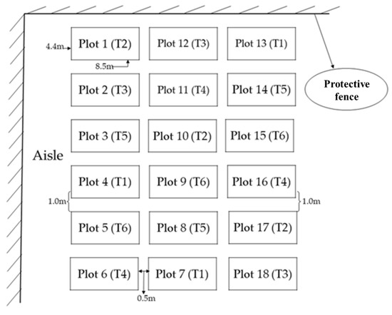 The organic fertilizer used in the experiment was a commercial organic fertilizer developed by Gansu Dahang Agricultural Technology Company. Total N, P, and K contents in organic fertilizers were 3.3%, 1.0%, and 0.7%, respectively, and the organic matter content was >64.0%. The amount of organic fertilizer used in T2, T3, T4, and T5 treatments was 3.0, 2.3, 1.5, and 0.8 t ha−1, respectively. For phosphorus, 150 kg P ha−1 was applied at sowing using calcium superphosphate (P2O5 > 16.0%) to all plots. The plot area for each replicate was 37.4 m2 (8.5 m × 4.4 m). The layout of the experimental blocks is shown in Figure 1.