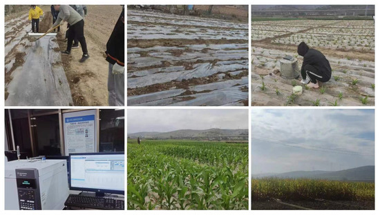 The alternative ridges and furrows technique was adopted for the plantation of maize (Figure 2). The ridges were mulched with a transparent polyethylene film (140 cm wide and 0.01 mm thick). The ridges were of two different sizes, i.e., wide-low ridges (70 cm in width and 15 cm in height) for field operations and narrow-high ridges (4 cm in width and 20 cm in height) for rainwater harvesting. Maize seeds were sown in furrows between two ridges. Two corn seeds were sown in each hole at a plant-to-plant spacing of 35 cm, and the seedlings were thinned. A seepage hole was dug every 1 m to ensure the effective infiltration of precipitation. No irrigation was performed during the experiment. A nitrogen fertilizer was applied at a depth of 6–7 cm. The disease, insect and grass damage, and other management were the same as those in the general high-yield field. Corn was harvested at ripening.