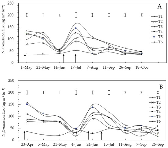 Figure 4. A and B represent the years 2020 and 2021 respectively. The dynamic changes of nitrous oxide emissions during the entire growth period of maize. The vertical bars represent the least significant difference (LSD) at p < 0.05. Arrows represent fertilization. T1: inorganic fertilizer; T2: 50.0% organic fertilizer; T3: 37.5% organic fertilizer; T4: 25.0% organic fertilizer; T5: 12.5% organic fertilizer; T6: no fertilizer.
