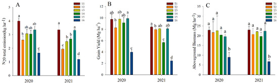 The total N2O emission for the fertilized plots was significantly higher in both years than in the control (Figure 5A). Substituting inorganic N with organic fertilizers reduced the total emission of N2O, and increased reductions in N2O were observed by substituting a higher portion of inorganic N, i.e., 50.0% substitution (T2), followed by 37.5% substitution (T3). Replacing inorganic fertilizers with organic fertilizers did not show any significant reductions in grain yield (Figure 5B) or aboveground biomass (Figure 5C).