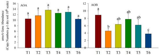Figure 6. amoA gene copy numbers of AOA and AOB in soil under different substitution ratios. The different uppercase letters indicate significant differences among soil amendments, with error bars that represent the standard deviation (p < 0.05, Duncan’s multiple-range test). T1: inorganic fertilizer; T2: 50.0% organic fertilizer; T3: 37.5% organic fertilizer; T4: 25.0% organic fertilizer; T5: 12.5% organic fertilizer; T6: no fertilizer.