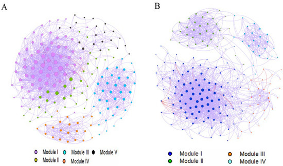 Figure 7. Network analysis of (A) AOA and (B) AOB OTUs modules. Modules were labelled with different colors in each network. The size of the OTU nodes indicates their degrees, and the purple line indicates a positive correlation, while the red line illustrates a negative correlation.