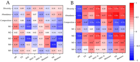 Figure 8. A and B represent the AOA and AOB respectively. Correlation analysis of microbial indicators on physicochemical properties of soil and N2O emissions and above-ground biomass. Red color represents positive correlations and blue represents negative correlations. The asterisk symbol represents statistical significance, where * stands for p < 0.05 and ** stands for p < 0.01. Abbreviations: total nitrogen (TN); soil water content (WC); soil organic carbon (SOC); nitrate nitrogen (NO3−N); ammonia nitrogen (NH4−N); N2O emission (NE).