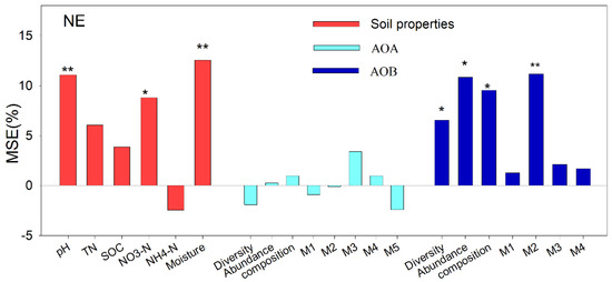 Figure 9. Association of nitrous oxide gas emissions with soil properties and ammonia oxidizing archaea and bacteria by a random forest algorithm. Significant predictors were chosen to perform the SEM analysis. This includes the following: total nitrogen (TN); soil organic carbon (SOC); nitrate nitrogen (NO3−N); ammonia nitrogen (NH4+−N); diversity (Shannon index); abundance (copy numbers); composition (first principal coordinates, PC1); and seven module eigengenes. * p < 0.05; ** p < 0.01.