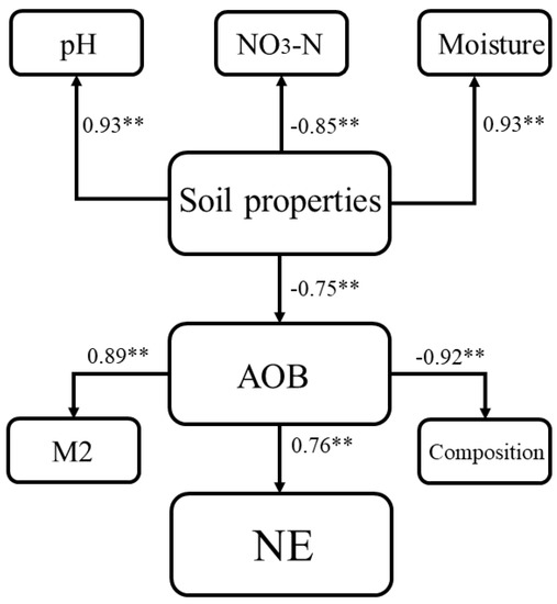Figure 10. Structural equation modelling of ammonia-oxidizing bacterial communities with variability in soil properties. Significant levels are denoted: ** p < 0.01. Standardized total effects (direct and indirect effects) calculated by SEMs are displayed.