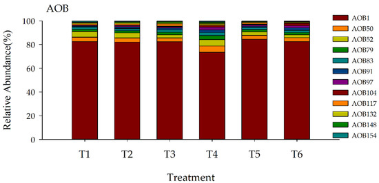 OTUs and Chao1 indices showed that fertilizer treatments significantly increased AOA and AOB richness compared to the control, but the diversity of AOA did not differ significantly between fertilizer treatments (Table 4). The organic fertilizer’s substitution significantly reduced OTUs’ number of AOB compared to urea alone. The number of OTUs significantly increased in the organic fertilizer replacement treatment (T3) compared with other organic fertilizer replacement treatments (T4, T5). The Shannon index of AOA was not affected but that of AOB showed a significant increase by the fertilizer treatments, but the effect of organic fertilizer was non-significant compared to inorganic fertilizers.