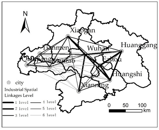 The results show that the whole UA radiated out from Wuhan, which is not only the geographical center of WUA but also the industrial and economic center. It can be seen that within the UA, some small-scale circles with strong interactions within them were formed. Tianmen, Qianjiang, and Xiantao with adjacent geographical locations and comparable city sizes, were closely linked, while Huangshi, Ezhou, and Huanggang also formed an industrial circle. These small industrial circles are the links of the inter-city industrial chain. Urban industrial structure optimization should take full consideration of industrial spatial linkages in the whole UA to develop a harmonious symbiosis with reasonable division of labor and complementary cooperation in urban industries.