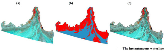 A silt coast is a large silt–muddy beach created by the action of river sedimentation and seawater erosion. In the LRE, the tidal flat is a typical mudflat with a gentle slope, and the coastline is indistinguishable because of the mixing of water and suspended sediments [40]. To use the instantaneous waterline for the accurate zonation of tidal flats, our study displayed a false color image by using the 5, 4, and 3 bands of Landsat-8 OLI images, which can significantly distinguish the objects of water, a tidal flat, and vegetation (Figure 2a). In the false color image, the red, dark-green, black, and bright-green areas represent vegetation, tidal flat, aquaculture pond, and water, respectively. To classify the water and land, a maximum likelihood classification method combined with a visual interpretation was conducted according to the color differences of the objects (Figure 2b), and then classical Canny edge detection was used to extract the instantaneous waterline in the study area. The mudflat waterline extracted by the algorithm is consistent with the original image. Thus, our study successfully extracted the instantaneous waterline of the silt–muddy beach in the LRE [41].