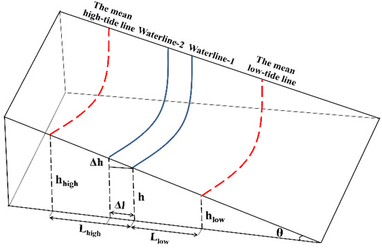 where h is the tidal level at the scene center time, θ is the slope of each shoreline, Lhigh is the correction distance of the high tide, Llow is the correction distance of the low tide, Hlow stands for the low tide data of the day, ΔH is the tide range of the day, t is the scene center time of the RS images, Tlow is the time of low tide that same day when Thigh is the time of high tide, Δh is the tidal level difference between two images at the scene center time, Δl is the instantaneous waterline distance between two images at the scene center time, and hhigh refers to the mean high tide data that same year when hlow stands for the mean low tide data.