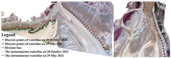 The morphological characteristics of tidal creeks in each tidal zone may differ due to the difference in hydrodynamic intensities and sedimentation in these regions. Therefore, the accurate zonation of tidal flats is important for the morphological study of tidal creeks. Previous studies have been carried out on the zonation of tidal flats using sediment characteristics [42], biological distribution [43], and spectral reflectance [28] but relied on subjective inferences. Therefore, our study further improved the zonation method of a tidal flat on the basis of the principle of tidal correction [44], as shown in Figure 3. The specific steps of tidal correction in the coastal wetlands of the LRE are as follows: (1) our study calculated the tidal information at the scene center time of the RS images using the tide gauge data (see Table 1); the tide levels (h) of RS images received on 29 May 2021 and 20 October 2021 were 1.449 m and 1.265 m, respectively and the tide level difference (Δh) between the two images was 0.185 m. (2) The shoreline of the study area was divided into three sections due to the intricate terrains of the coastal wetlands in the LRE, as shown in Figure 4. Our study selected the instantaneous waterline (29 May 2021) as the baseline of the tide correction model, set the vertical line from the baseline to another instantaneous waterline every 300 m as the division line, and then calculated the average length of the division line in each shoreline to obtain the distance of two instantaneous waterlines in the same region (Δl). (3) Our study calculated the slope of each shoreline (θ) and the correction distance of the high tide (Lhigh) and the low tide (Llow) using Equations (1) and (2). Our study obtained the positions of theoretical high tide and low tide by constructing buffer zones based on the correction distance and then conducted a field investigation to assist in the zonation of the tidal flat.