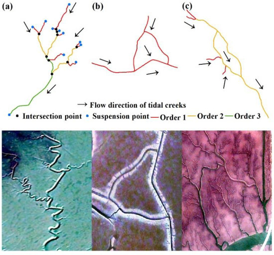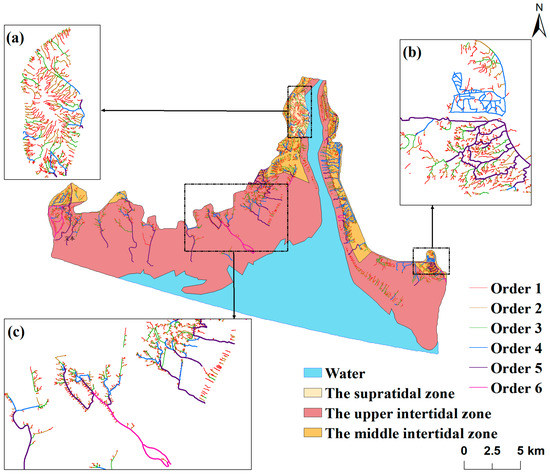 In the tidal flat of estuary deltas, the morphological characteristics of tidal creeks are quite different because of the topographic elevation change. To demonstrate the differences in the morphological characteristics of the tidal flats of the LRE in detail, our study divided them into several typical areas. Figure 7 shows the order of the tidal creeks in the three regions. In the LRE, the Yuanyang island (Figure 7A), the south of the East Bank (Figure 7B), and the middle of the West Bank (Figure 7C) represent the supratidal zone (a), the upper intertidal zone (b), and the middle intertidal zone (c), respectively. In this region of the Yuanyang island, the tidal creeks are densely distributed in the tidal flat, with a high ratio of tidal creek branches for orders 1 to 3, and the main tidal creeks, for orders 4 and 5, present a short-branched type. In the south of the East Bank of the LRE, order 6 tidal creeks are also present. The main tidal creeks for orders 4 and 5 are in high ratio, and most of them are distributed on the tidal flat in an island shape. In the middle of the West Bank of the LRE, the tidal creek branches are short and sparsely distributed but the main tidal creeks are relatively long because of the influence of tidal hydrodynamics. In the study area, most of the tidal creeks have developed in the shape of a “tidal tree”, where the tidal creek branches are concentrated near the mean high-tide level in a dendritic pattern and the main tidal creeks are perpendicular to the shoreline and disappear near the average low-tide level in a pattern similar to the main trunk of a tree. According to the principles of genetic classification proposed by Shao et al. [50], the tidal creeks on a tidal flat of the LRE are scoured by the tidal currents.