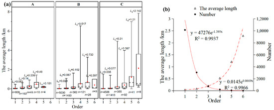 Figure 8. (a) Average length-number boxplot and (b) fitting analysis of tidal creeks of different orders in the coastal wetlands of the Liao River Estuary (La: average length of tidal creeks; n: number of tidal creeks; A: the supratidal zone; B: the upper intertidal zone; C: the middle intertidal zone).