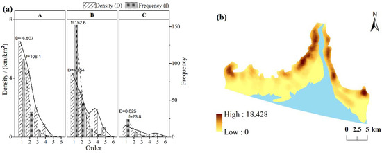 Figure 9. Statistics of (a) density and frequency of tidal creeks of different orders and (b) total density of tidal creeks in the coastal wetlands of the Liao River Estuary. (A: the supratidal zone; B: the upper intertidal zone; C: the middle intertidal zone).