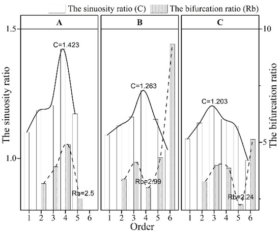 Figure 10. Statistics of sinuosity ratios and bifurcation ratios of tidal creeks of different orders in the coastal wetlands of the Liao River Estuary. (A: the supratidal zone; B: the upper intertidal zone; C: the middle intertidal zone).
