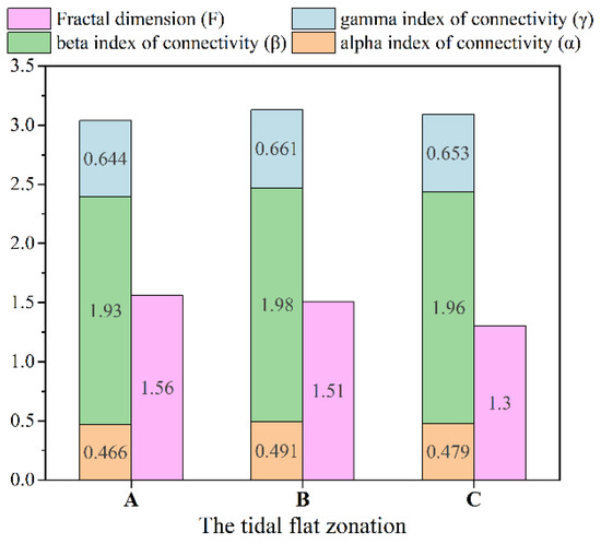 Figure 11. Statistics of connectivity and fractal dimension of tidal creek networks in the coastal wetlands of the Liao River Estuary. (A: the supratidal zone; B: the upper intertidal zone; C: the middle intertidal zone).